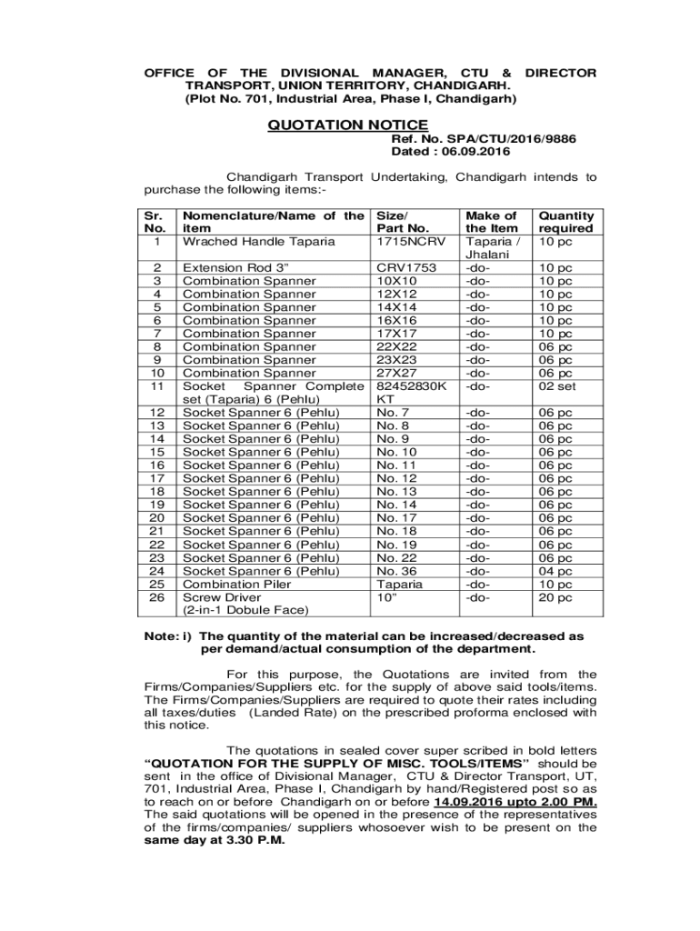 OFFICE OF THE DIVISIONAL MANAGER, CTU & DIRECTOR TRANSPORT, UNION TERRITORY, CHANDIGARH. (Plot No. 701, Industrial Area, Phase I, Chandigarh)QUOTATION NOTICE Ref. No. SPA/CTU/2016/9886 Dated : 06.09.2016