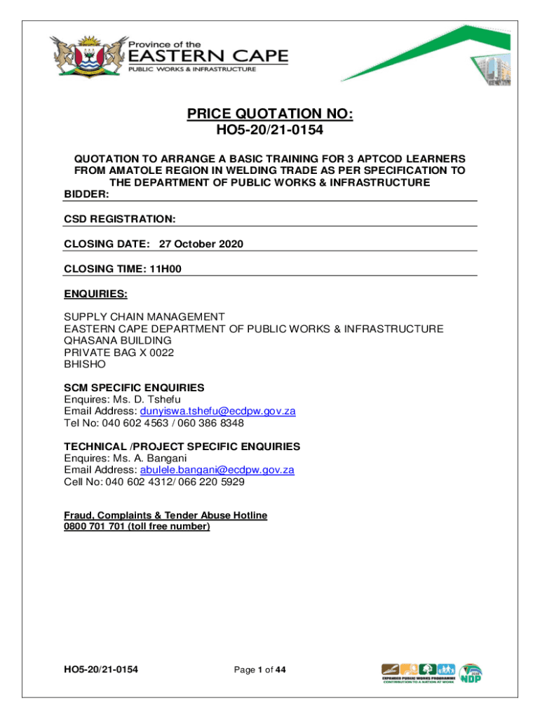 PRICE QUOTATION NO: HO520/210154 QUOTATION TO ARRANGE A BASIC TRAINING FOR 3 APT COD LEARNERS FROM ANATOLE REGION IN WELDING TRADE AS PER SPECIFICATION TO THE DEPARTMENT OF PUBLIC WORKS & INFRASTRUCTURE