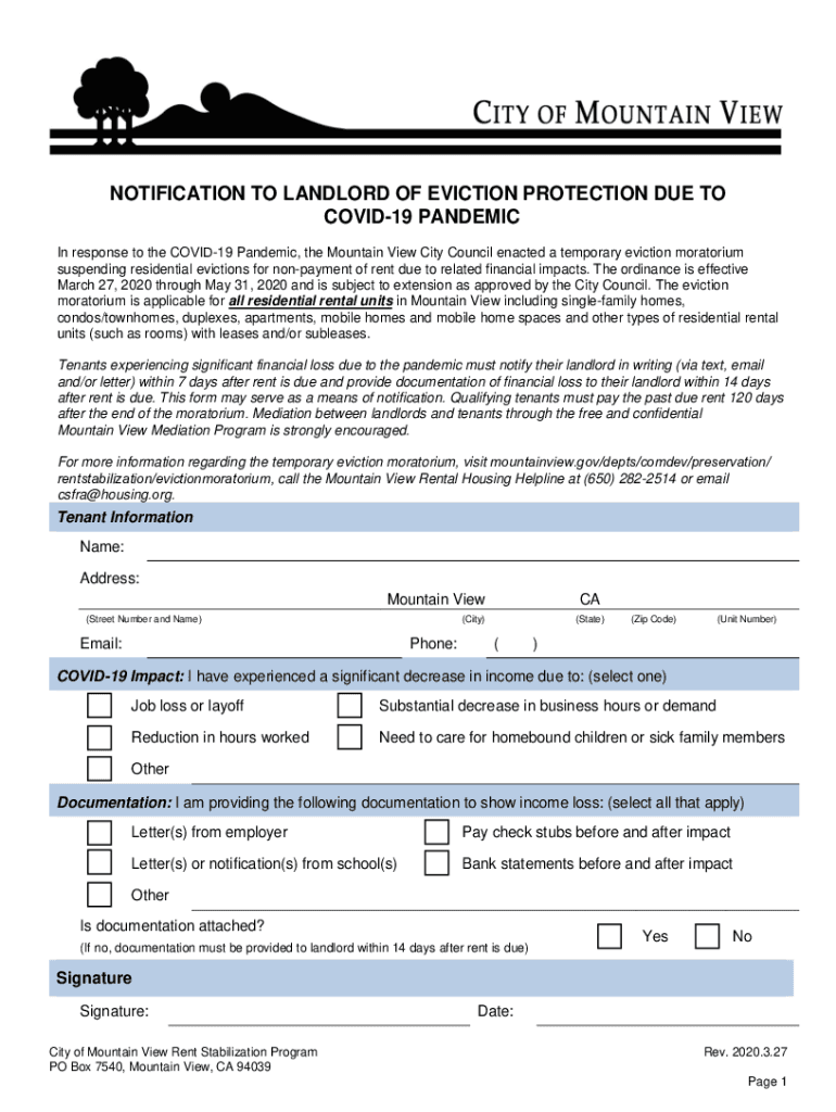 NOTIFICATION TO LANDLORD OF EVICTION PROTECTION DUE TO COVID-19 PANDEMIC In response to the COVID-19 Pandemic, the Mountain View City Council enacted a temporary eviction moratorium suspending residential