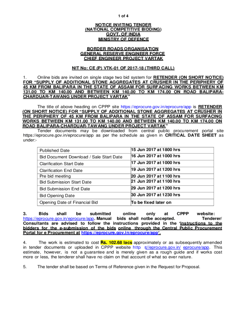 1 of 4NOTICE INVITING TENDER (NATIONAL COMPETITIVE BIDDING) GOVT. OF INDIA MINISTRY OF Defense BORDER ROADS Organization GENERAL RESERVE ENGINEER FORCE CHIEF ENGINEER PROJECT PARTAKE NIT No: CE (P)