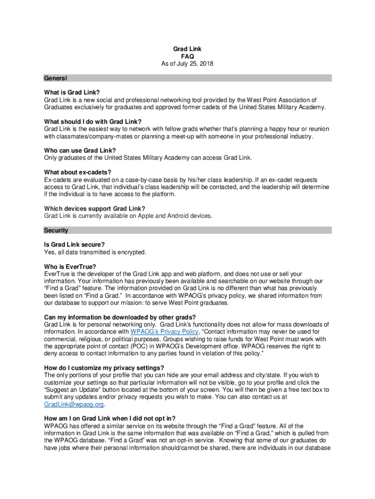 Grad Link FAQ As of July 25, 2018, General What is Grad Link? Grad Link is a new social and professional networking tool provided by the West Point Association of Graduates exclusively for graduates