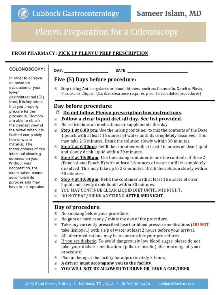 Same her Islam, MDPlenvu Preparation for a Colonoscopy FROM PHARMACY: PICK UP PLENTY PREP PRESCRIPTION COLONOSCOPY:DAY: ___In order to achieve an accurate evaluation of your lower gastrointestinal