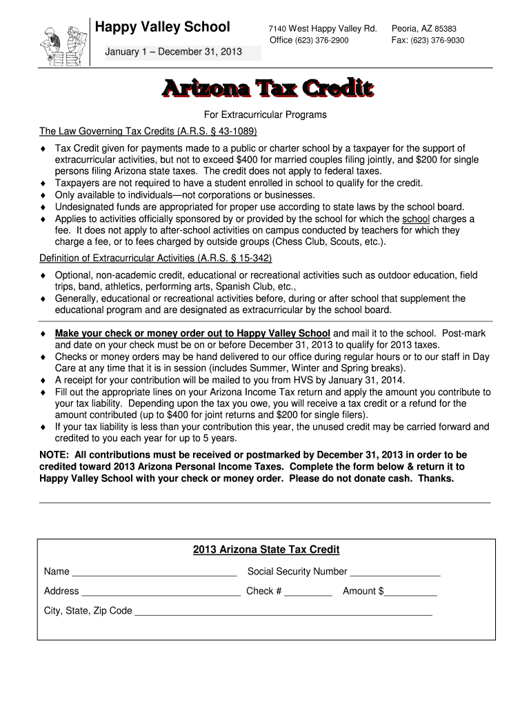 Happy Valley School 7140 West Happy Valley Rd. Office (623) 376-2900 Peoria, AZ 85383 Fax: (623) 376-9030 January 1 December 31, 2013, For Extracurricular Programs The Law Governing Tax Credits (A.R.S.