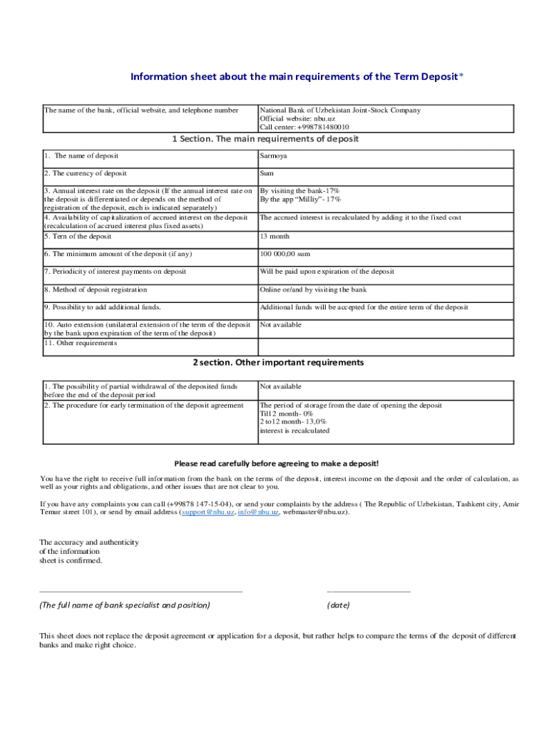 Information sheet about the main requirements of the Term Deposit* The name of the bank, official website, and telephone numberNational Bank of Uzbekistan Rootstock Company Official website: NBL.UZ