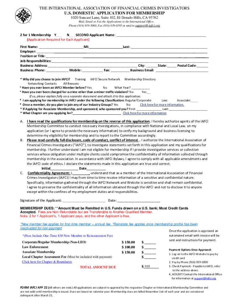 THE INTERNATIONAL ASSOCIATION OF FINANCIAL CRIMES INVESTIGATORS U.S. DOMESTIC APPLICATION FOR MEMBERSHIP 1020 Sun cast Lane, Suite 102, El Dorado Hills, CA 95762 Mail, Email or Fax the Applications