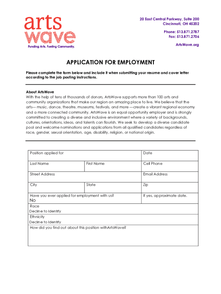 20 East Central Parkway, Suite 200 Cincinnati, OH 45202 Phone: 513.871.2787 Fax: 513.871.2706 Arts Wave. Reapplication FOR EMPLOYMENT Please complete the form below and include it when submitting