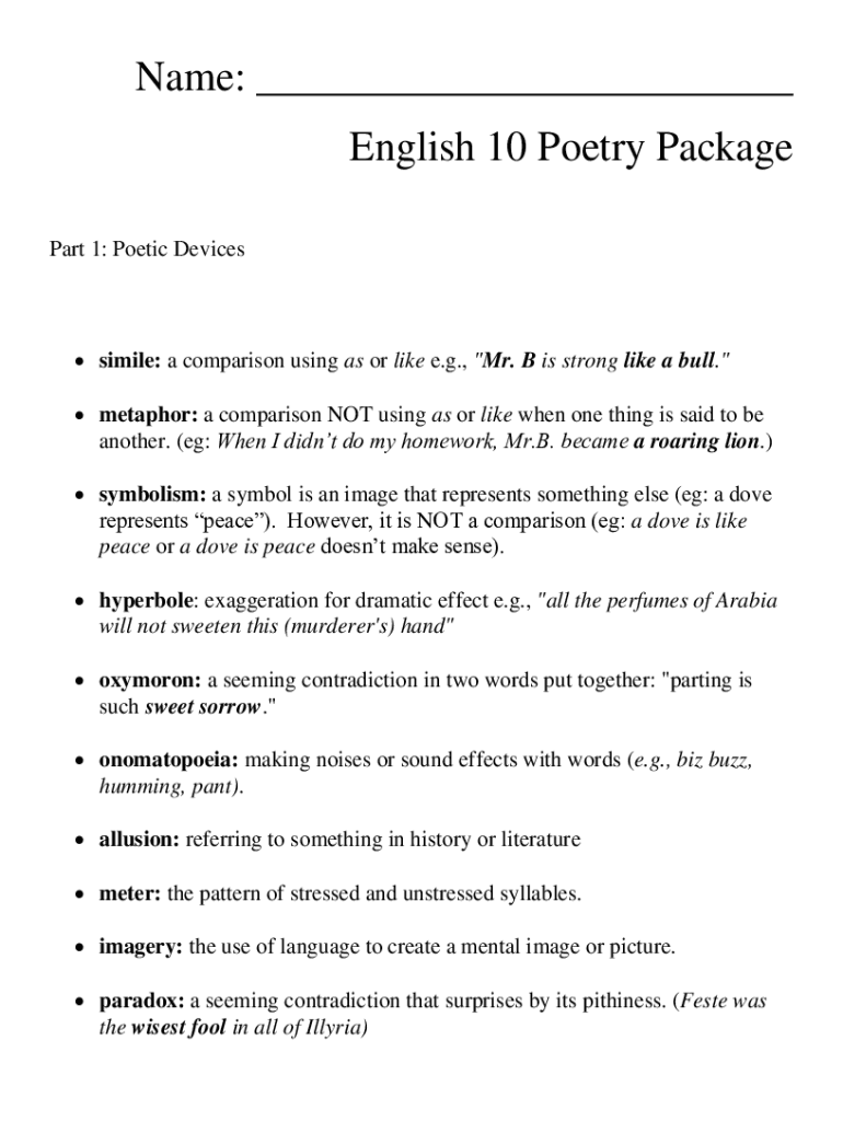 Get the free Name: English 10 Poetry ...