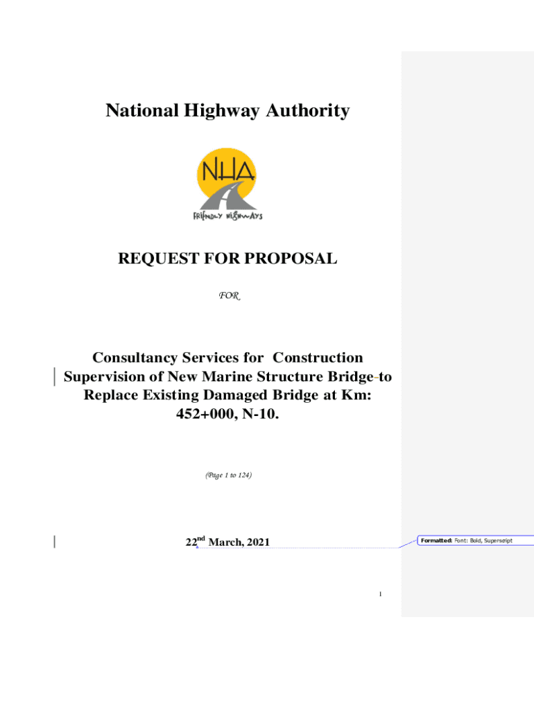 National Highway AuthorityREQUEST FOR PROPOSAL Consultancy Services for Construction Supervision of New Marine Structure Bridge to Replace Existing Damaged Bridge at Km: 452+000, N10.(Page 1 to 124)22nd