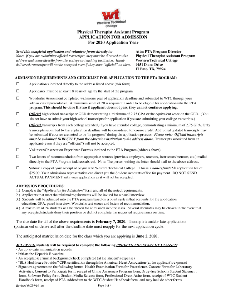 Physical Therapist Assistant Program APPLICATION FOR ADMISSION For 2020 Application Year Send this completed application and volunteer forms directly to: Note: if you are submitting official transcripts,