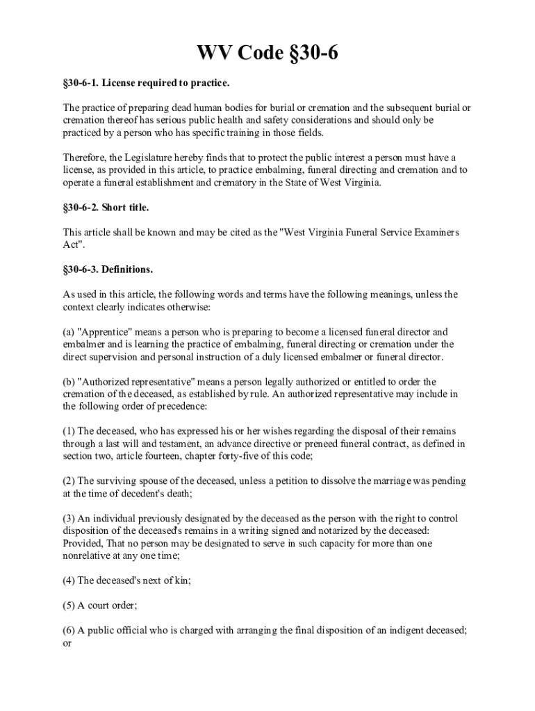 WV Code 306 3061. License required to practice. The practice of preparing dead human bodies for burial or cremation and the subsequent burial or cremation thereof has serious public health and safety
