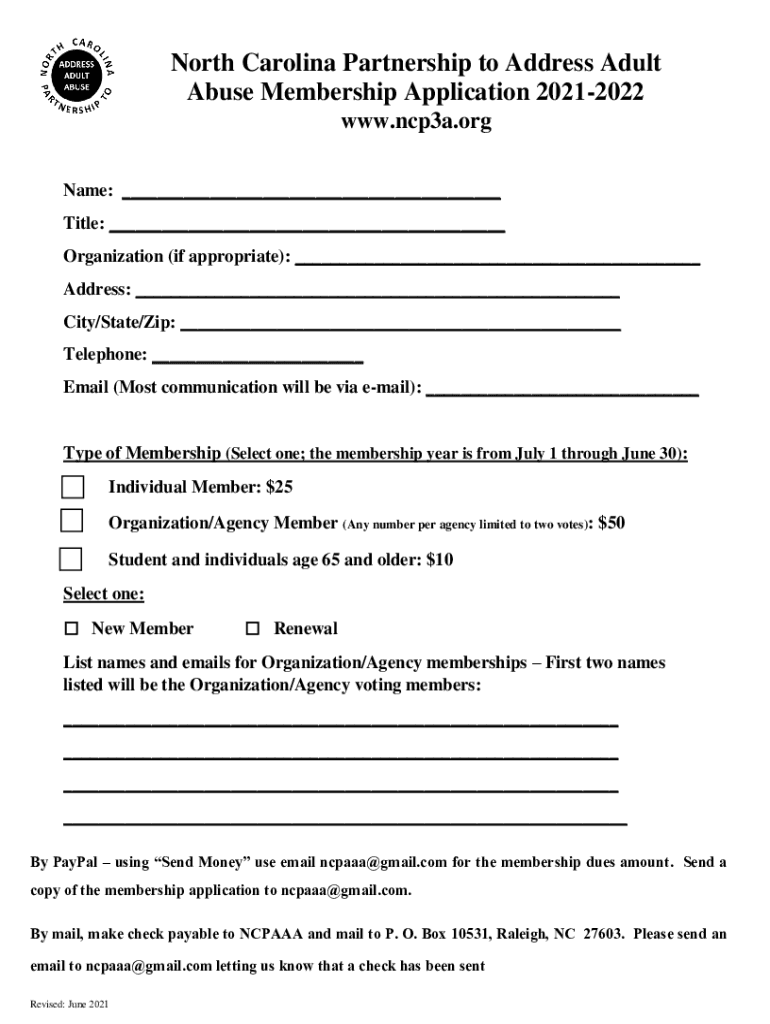 North Carolina Partnership to Address Adult Abuse Membership Application 20212022 www.ncp3a.org Name: ___ Title: ___ Organization (if appropriate): ___ Address: ___ City/State/Zip: ___ Telephone: