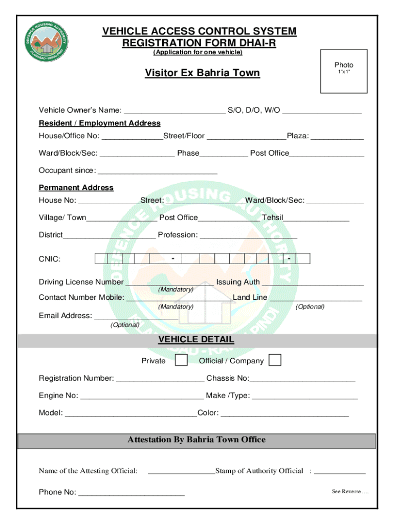 VEHICLE ACCESS CONTROL SYSTEM REGISTRATION FORM HAIR (Application for one vehicle)Photo 1×1Visitor Ex Bahia TownVehicle Owners Name: ___ S/O, D/O, W/O ___ Resident / Employment Address House/Office