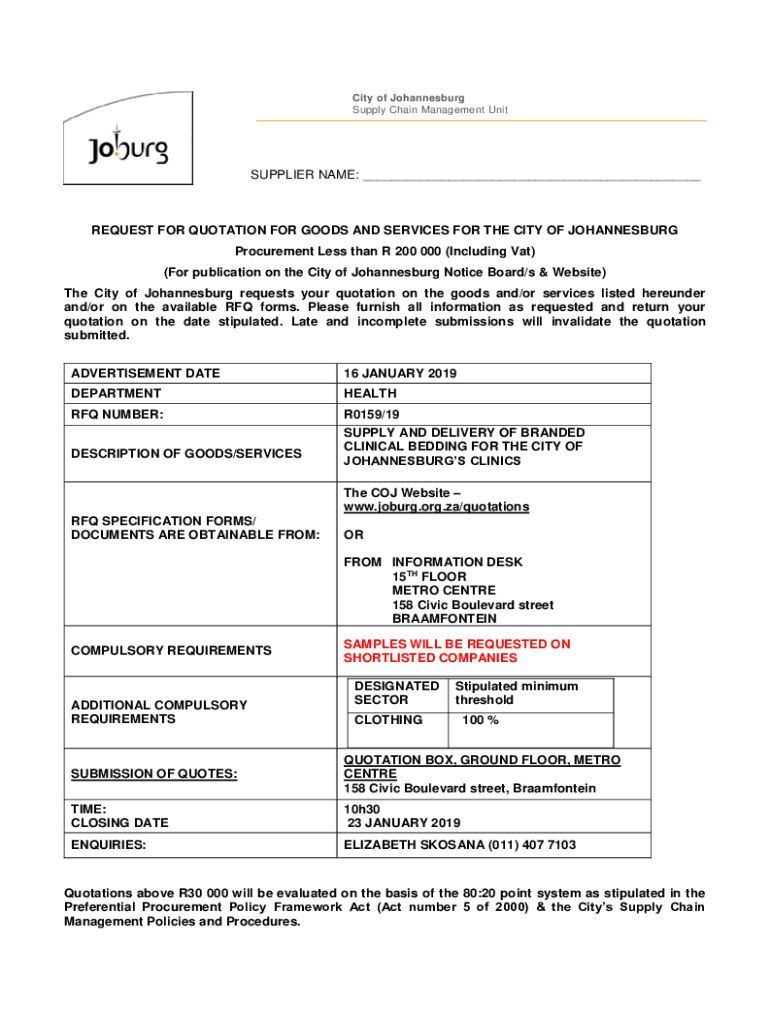 City of Johannesburg Supply Chain Management UnitSUPPLIER NAME: ___REQUEST FOR QUOTATION FOR GOODS AND SERVICES FOR THE CITY OF JOHANNESBURG Procurement Less than R 200 000 (Including Vat) (For publication