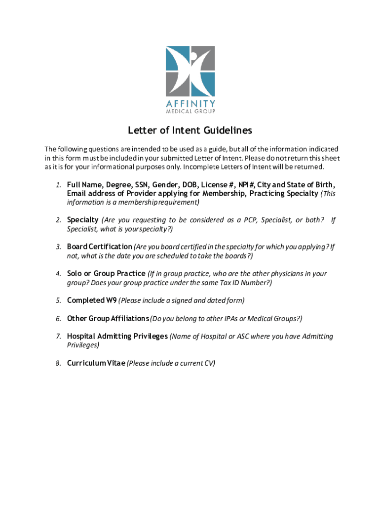 Letter of Intent Guidelines The following questions are intended to be used as a guide, but all the information indicated in this form must be included in your submitted Letter of Intent. Please do
