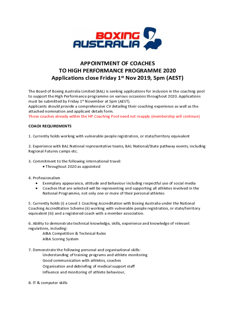 APPOINTMENT OF COACHES TO HIGH PERFORMANCE Program 2020 Applications close Friday 1st Nov 2019, 5pm (AEST) The Board of Boxing Australia Limited (BAD) is seeking applications for inclusion in the