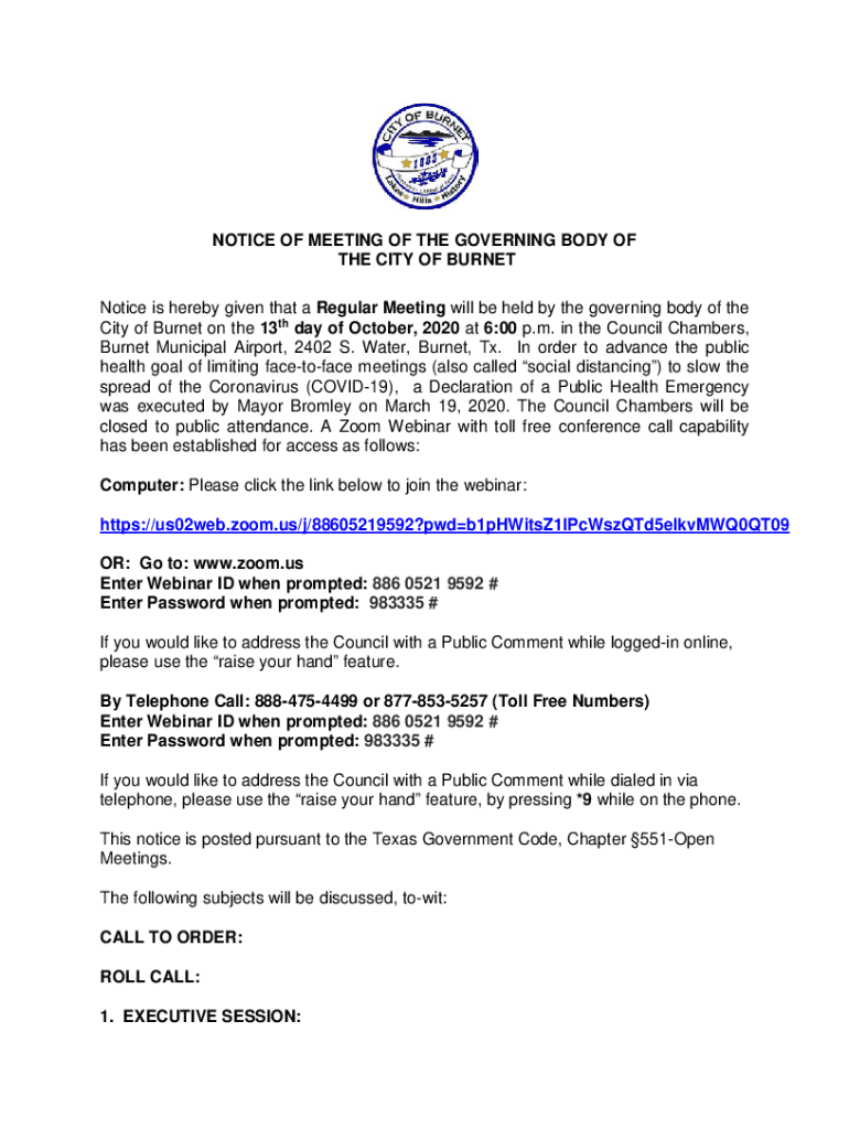 NOTICE OF MEETING OF THE GOVERNING BODY OF THE CITY OF BURNED Notice is hereby given that a Regular Meeting will be held by the governing body of the City of Burned on the 13th day of October 2020