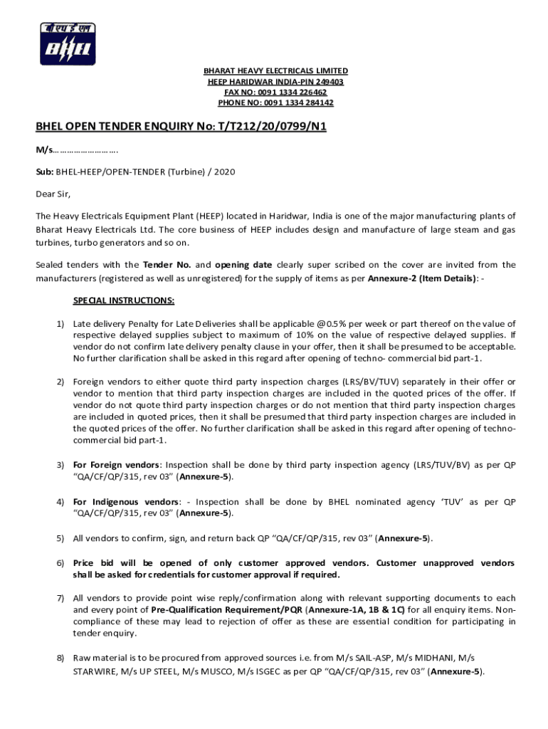 Get the free BHEL OPEN TENDER ENQUIRY No: T/T212/20/0799/N1