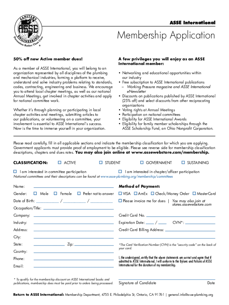 ASSE InternationalMembership Application 50% off new Active member dues! As a member of ASSE International, you will belong to an organization represented by all disciplines of the plumbing and mechanical
