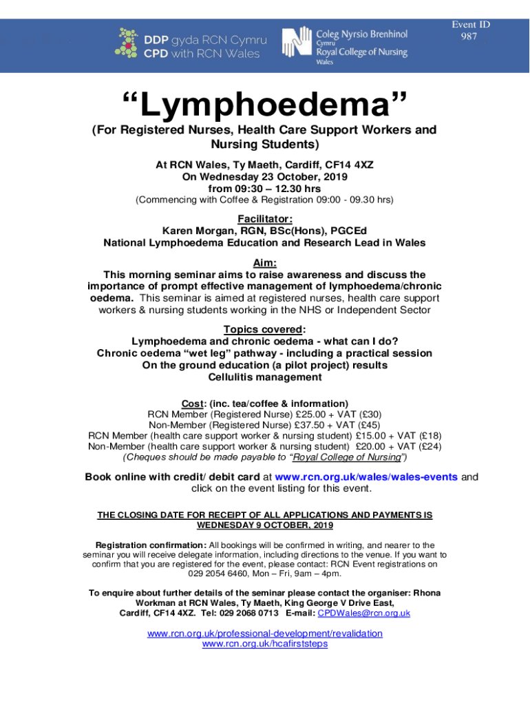 Event ID 987Lymphoedema (For Registered Nurses, Health Care Support Workers and Nursing Students) At RCN Wales, Ty Math, Cardiff, CF14 4XZ On Wednesday 23 October 2019 from 09:30 12.30 hrs (Commencing
