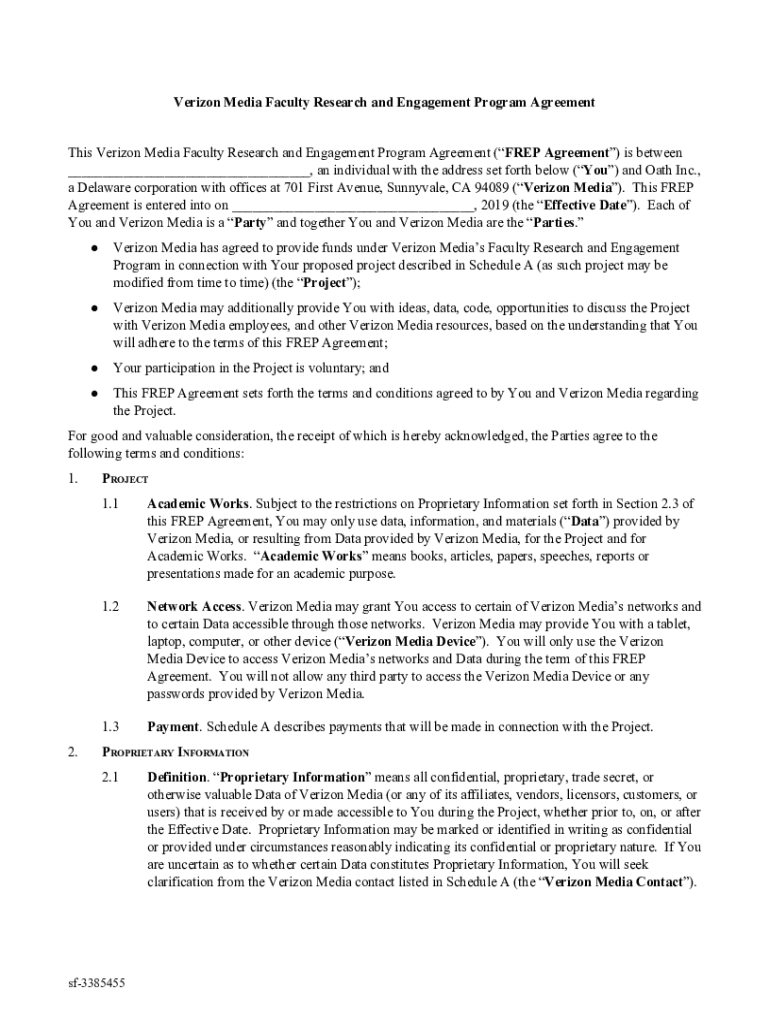 Verizon Media Faculty Research and Engagement Program Agreement This Verizon Media Faculty Research and Engagement Program Agreement (FREE Agreement) is between ___, an individual with the address
