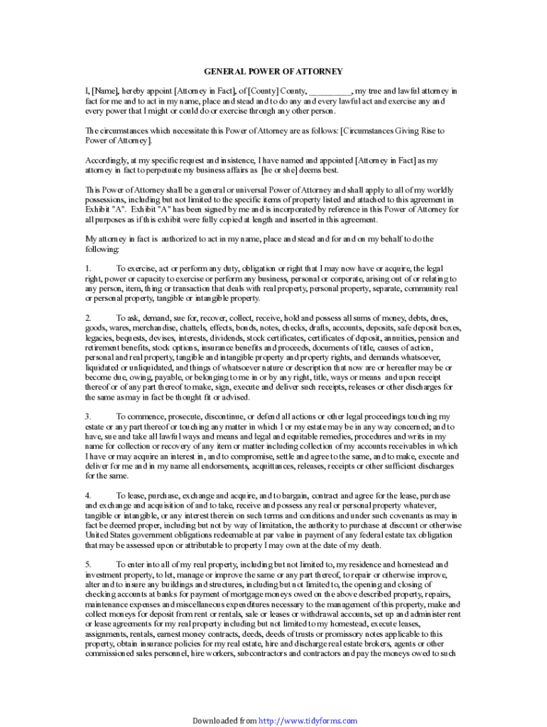 GENERAL POWER OF ATTORNEY I, [Name], hereby appoint [Attorney in Fact], of [County] County, ___, my true and lawful attorney in fact for me and to act in my name, place and stead and to do any and