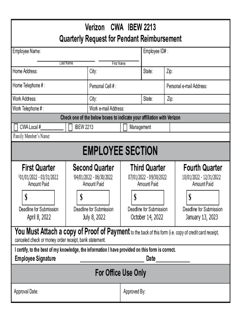Verizon CWA IBEX 2213 Quarterly Request for Pendant Reimbursement Employee Name:Employee ID# : Last NameFirst Namesake Address:City:Home Telephone # :Personal Cell # :Work Address:City:Work Telephone