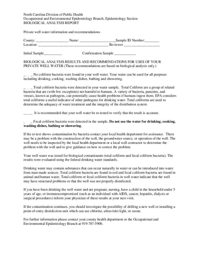 North Carolina Division of Public Health Occupational and Environmental Epidemiology Branch, Epidemiology Section BIOLOGICAL ANALYSIS REPORT Private well water information and recommendations County: