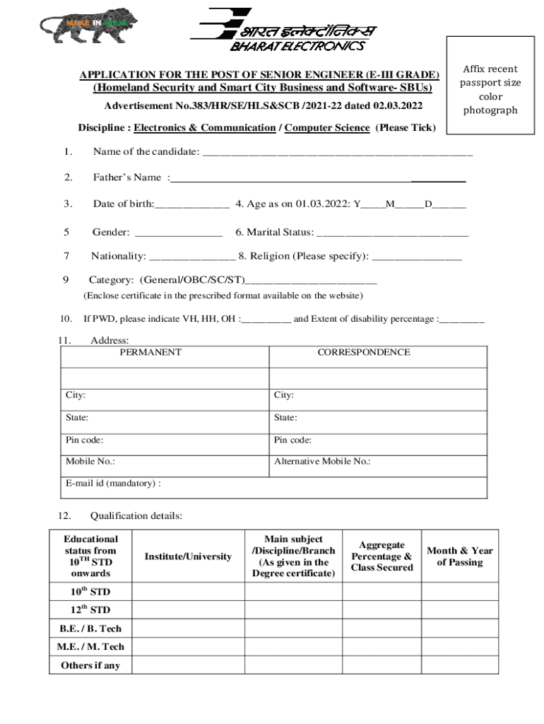 APPLICATION FOR THE POST OF SENIOR ENGINEER (III GRADE)(Homeland Security and Smart City Business and Software Bus) Advertisement No.383/HR/SE/HLS&SCB /202122 dated 02.03.2022 Discipline : Electronics
