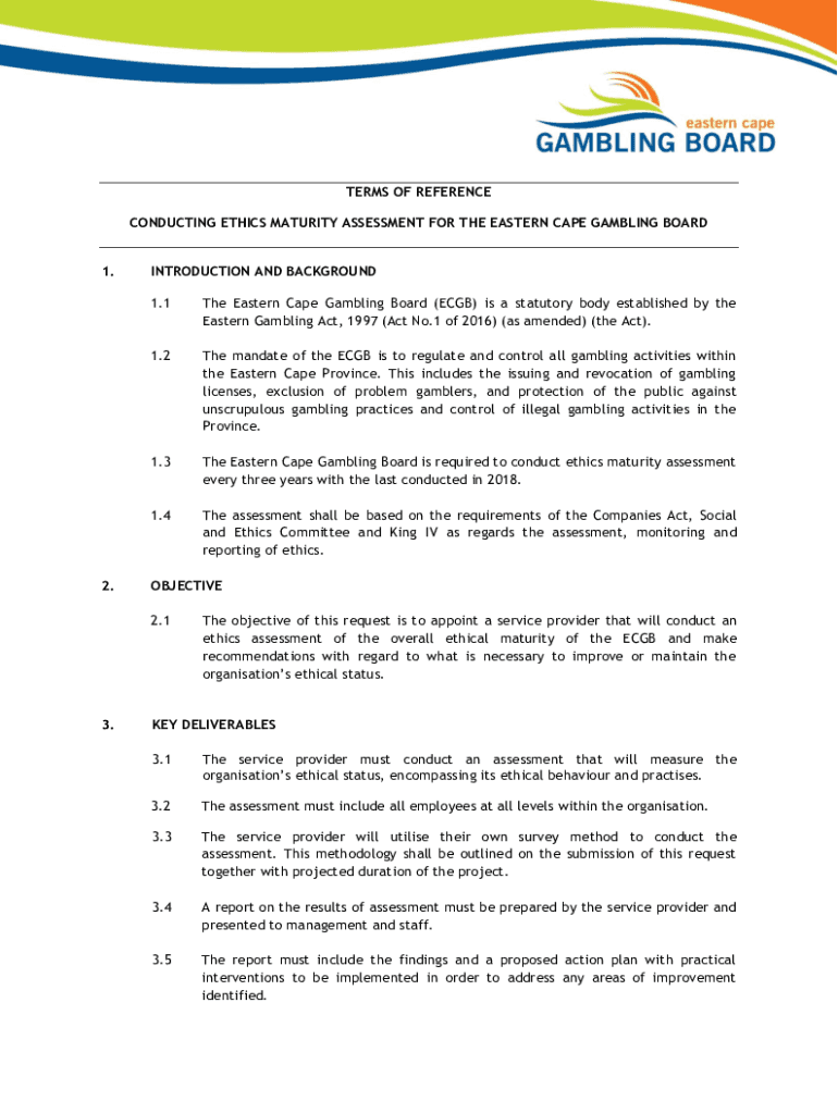 TERMS OF REFERENCE CONDUCTING ETHICS MATURITY ASSESSMENT FOR THE EASTERN CAPE GAMBLING BOARD1.2.INTRODUCTION AND BACKGROUND 1.1The Eastern Cape Gambling Board (ECG) is a statutory body established
