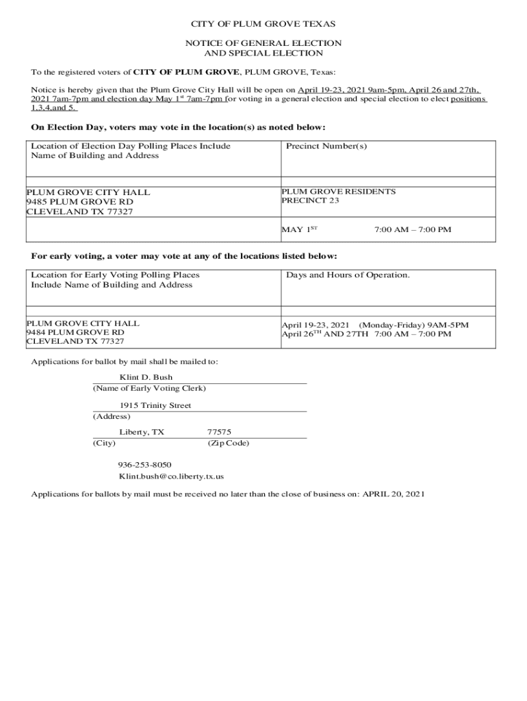 CITY OF PLUM GROVE TEXAS NOTICE OF GENERAL ELECTION AND SPECIAL ELECTION To the registered voters of CITY OF PLUM GROVE, PLUM GROVE, Texas: Notice is hereby given that the Plum Grove City Hall will