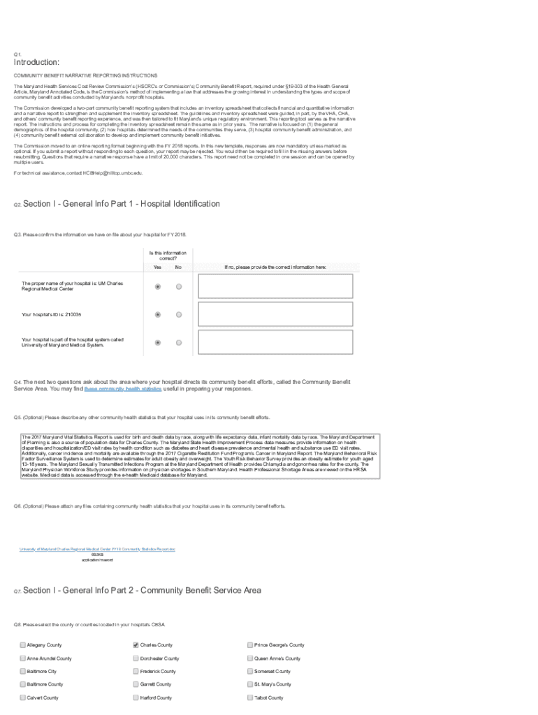 Q1. Introduction: COMMUNITY BENEFIT NARRATIVE REPORTING INSTRUCTIONS The Maryland Health Services Cost Review Commissions (HS CRC\'s or Commission\'s) Community Benefit Report, required under 19303