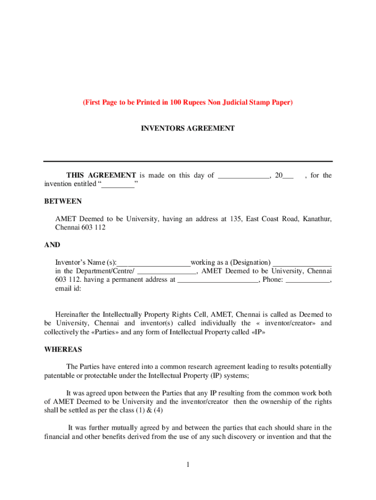 (First Page to be Printed in 100 Rupees Non-Judicial Stamp Paper)INVENTORS AGREEMENTS AGREEMENT is made on this day of ___, 20___ invention entitled ___, for between MET Deemed to be University, having