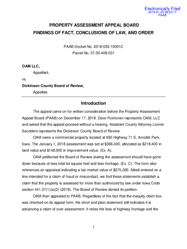 Electronically Filed 20190125 08:23:17 PAABPROPERTY ASSESSMENT APPEAL BOARD FINDINGS OF FACT, CONCLUSIONS OF LAW, AND ORDER SAAB Docket No. 201803010001C Parcel No. 0730408031OAM LLC, Appellant, vs.