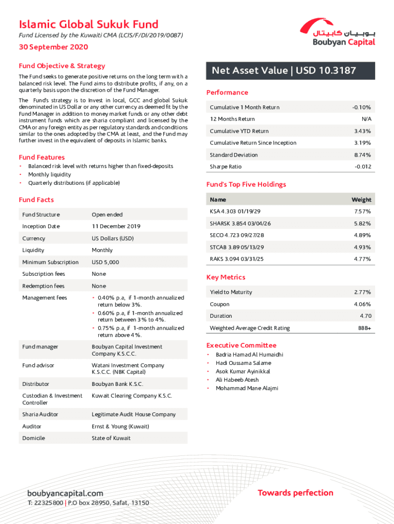 Islamic Global Sunk Fund Licensed by the Kuwaiti CMA (LUIS/F/DI/2019/0087)30 September 2020 Fund Objective & Strategy The Fund seeks to generate positive returns on the long term with a balanced risk