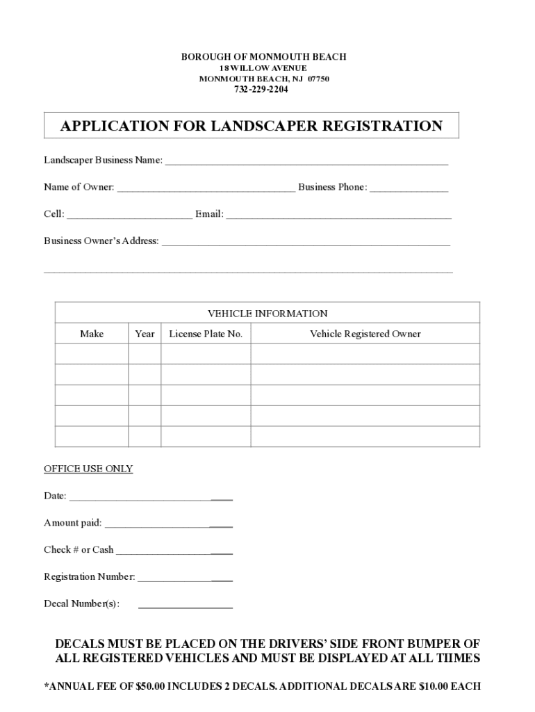 BOROUGH OF MONMOUTH BEACH18 WILLOW AVENUEMONMOUTH BEACH, NJ 077507322292204APPLICATION FOR LANDSCAPER REGISTRATION