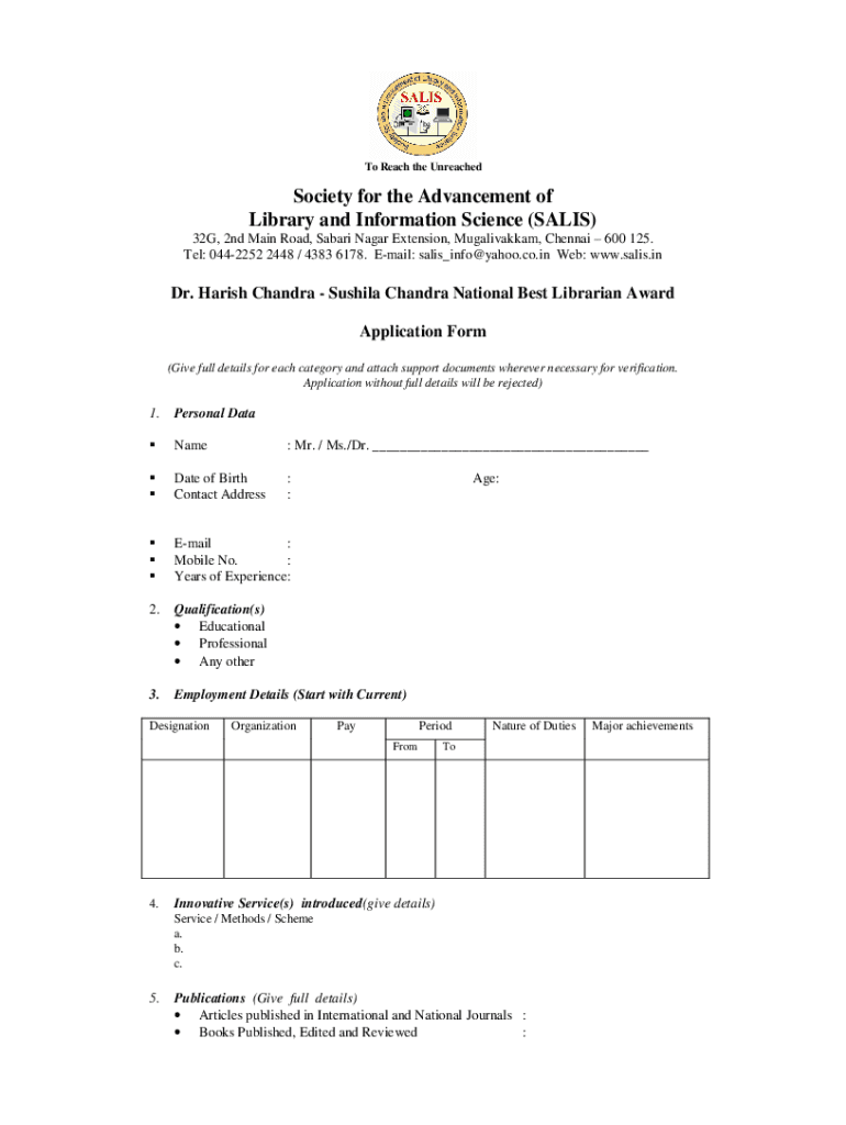 Get the free Dr. Harish Chandra-Sushila ChandraBest Librarian Award