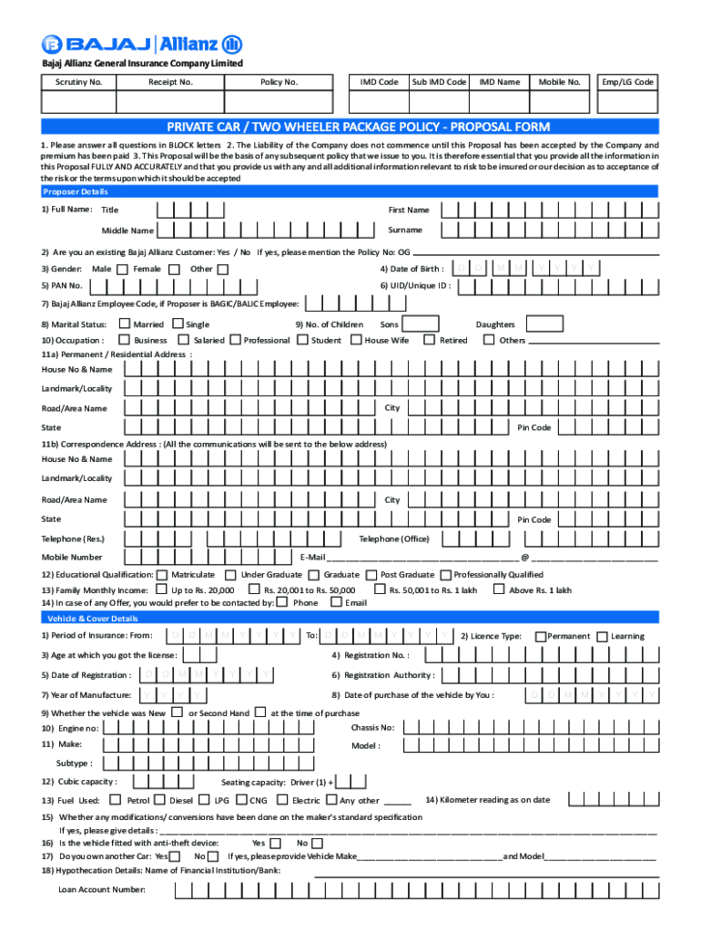 Bajaj Allianz General Insurance Company Limited Scrutiny No. Receipt No. Policy No.IMD Codes IMD Code IMD Name Mobile No. EMP/LG Derivate CAR / TWO WHEELER PACKAGE POLICY PROPOSAL FORM 1. Please answer