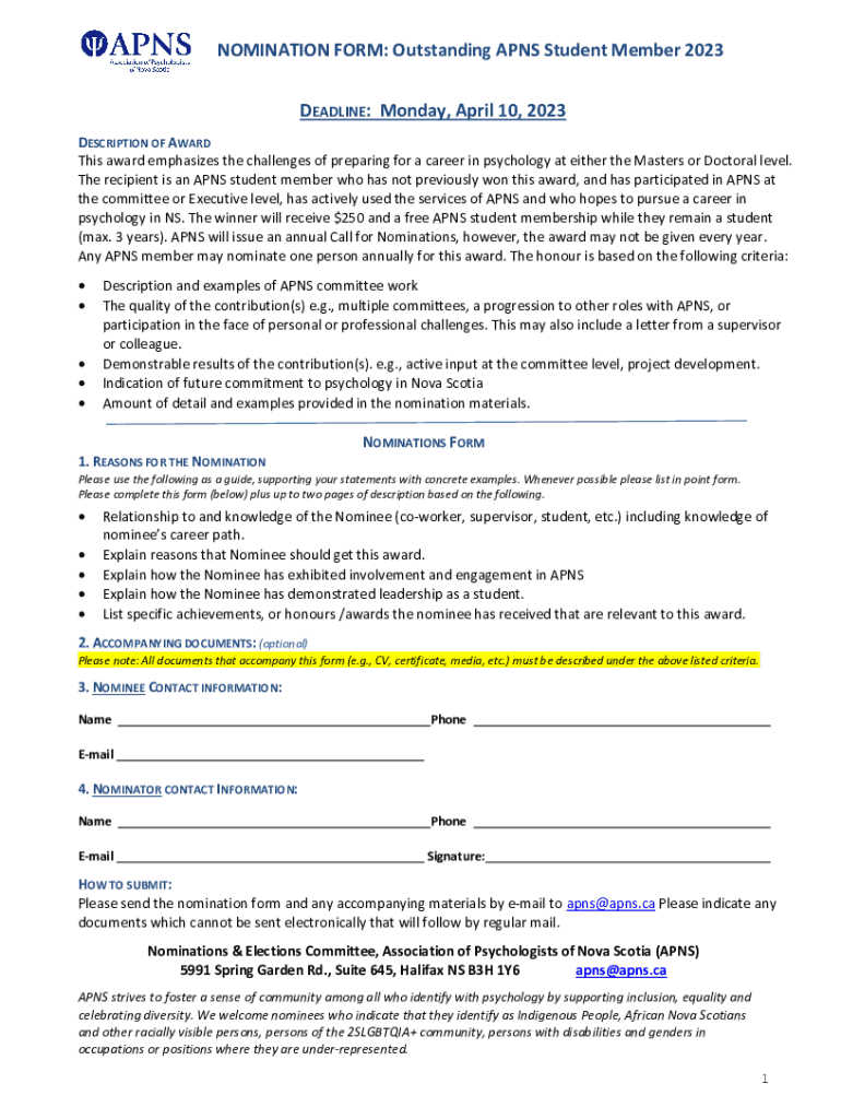 NOMINATION FORM: Outstanding APNs Student Member 2023 DEADLINE: Monday, April 10, 2023, DESCRIPTION OF AWARD This award emphasizes the challenges of preparing for a career in psychology at either