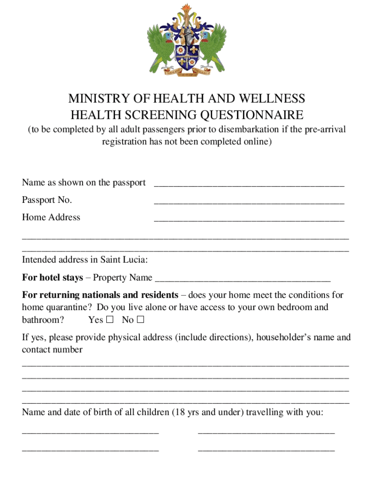 MINISTRY OF HEALTH AND WELLNESS HEALTH SCREENING QUESTIONNAIRE (to be completed by all adult passengers prior to disembarkation if the prearrival registration has not been completed online)Name as