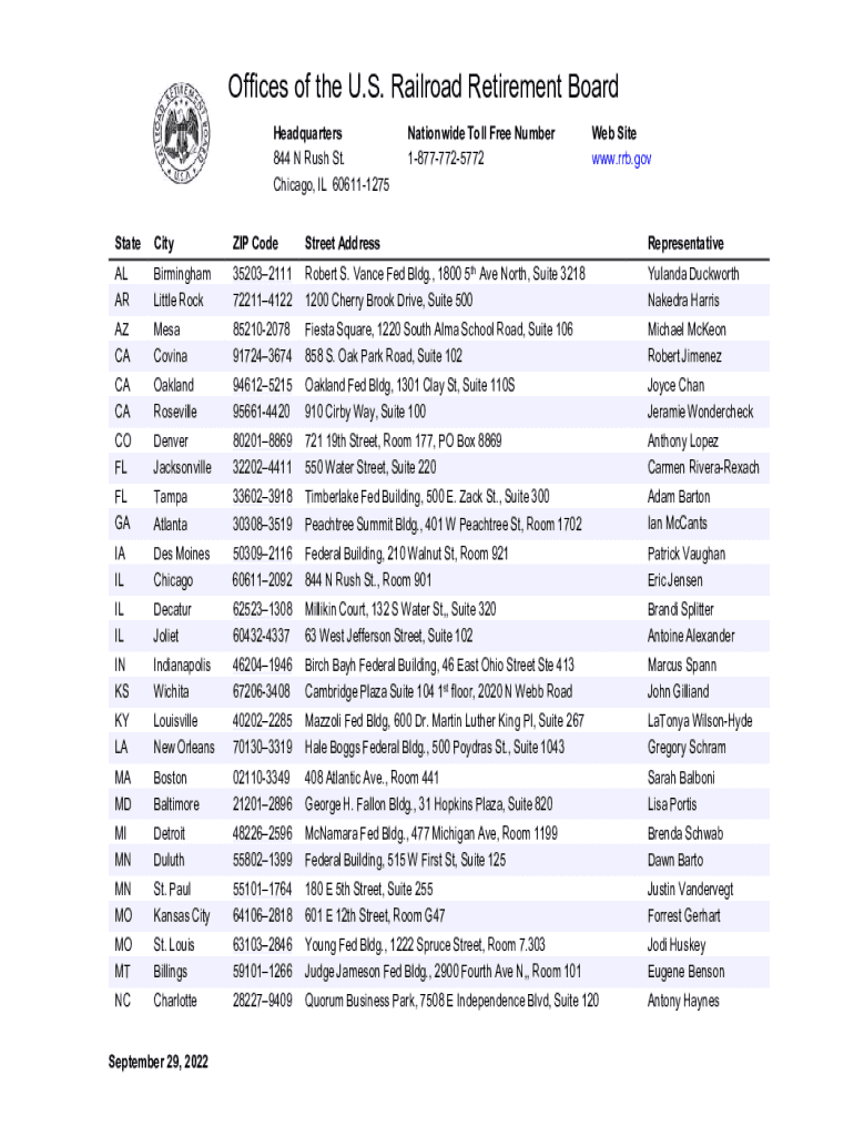 Offices of the U.S. Railroad Retirement Board Headquarters 844 N Rush St. Chicago, IL 606111275 StateCityZIP Code Nationwide Toll Free Number 18777725772Web Site www.rrb.govStreet AddressRepresentativeAL