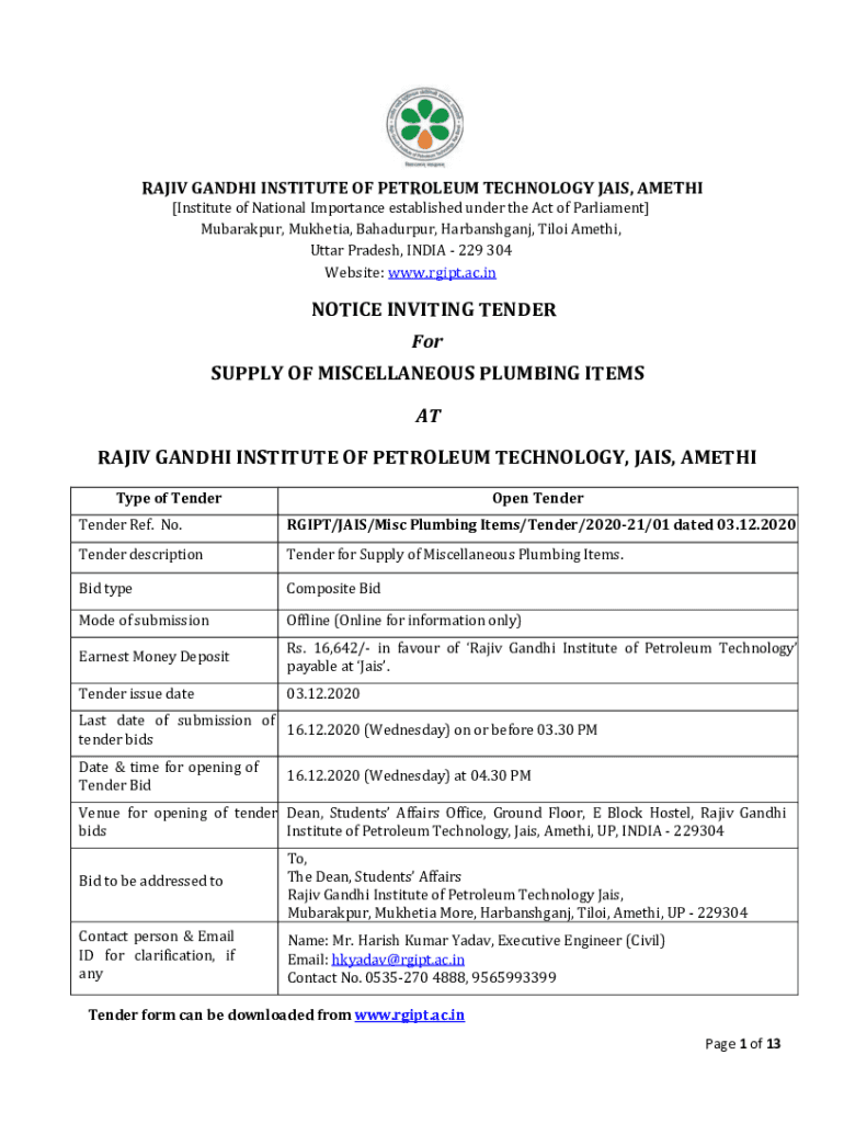 Get the free Notice Inviting Tender For Supply of Miscellaneous Plumbing ...