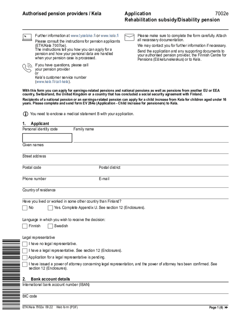 Reset formAuthorised pension providers / Reapplication 7002e Rehabilitation subsidy/Disability pensionFurther information at www.tyoelake.fi or www.kela.fi Please consult the instructions for pension
