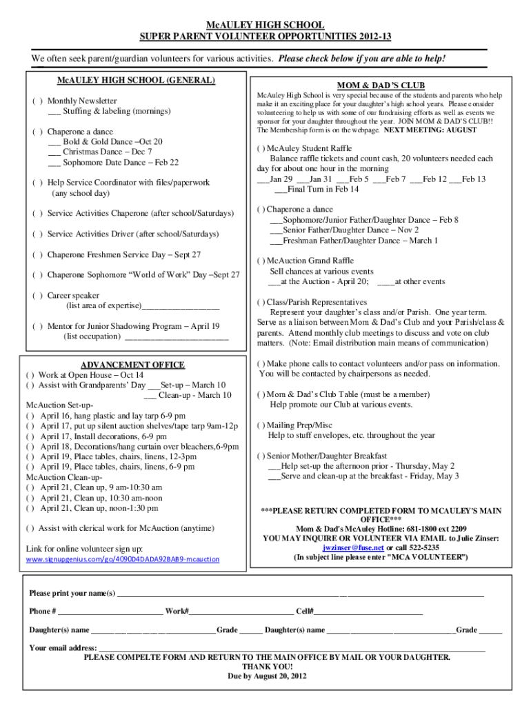 McCauley HIGH SCHOOL SUPER PARENT VOLUNTEER OPPORTUNITIES 201213 We often seek parent/guardian volunteers for various activities. Please check below if you are able to help! McCauley HIGH SCHOOL (GENERAL)