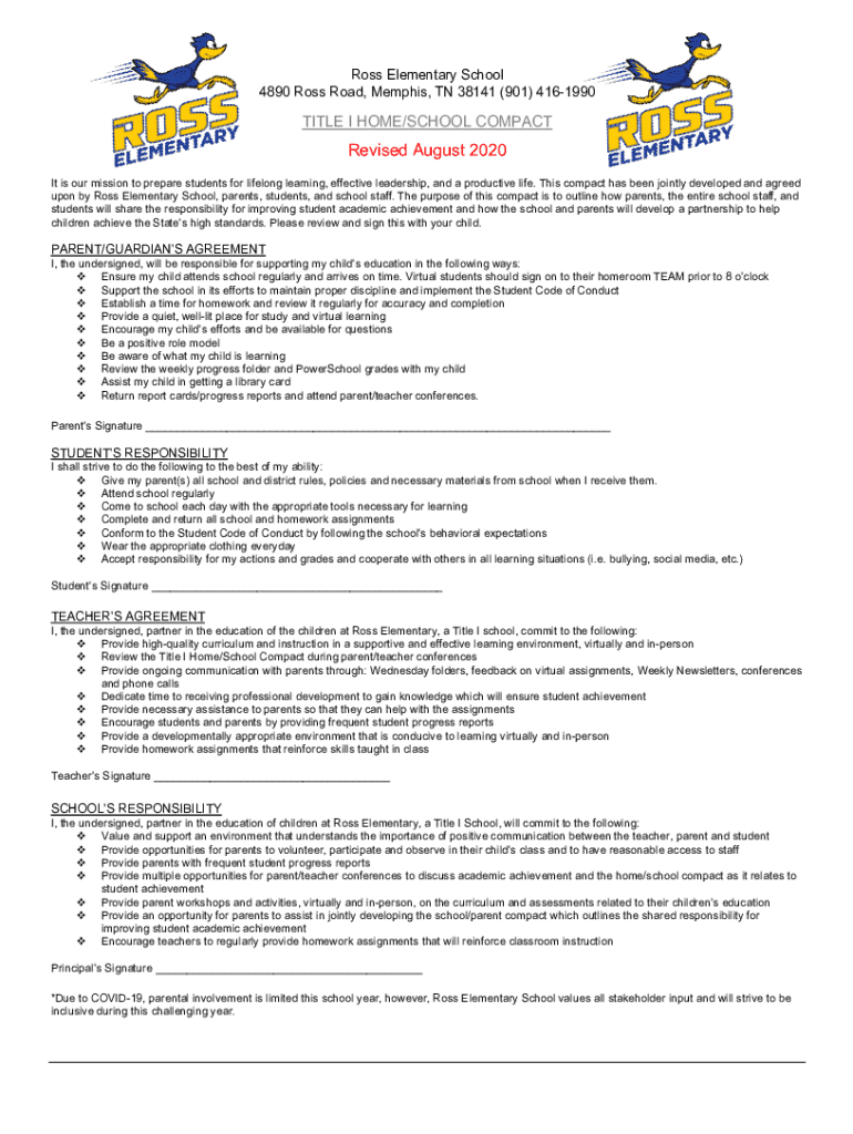 Ross Elementary School 4890 Ross Road, Memphis, TN 38141 (901) 4161990TITLE I HOME/SCHOOL COMPACTRevised August 2020 It is our mission to prepare students for lifelong learning, effective leadership,