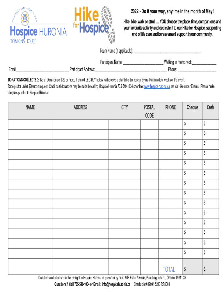 2022 Do it your way, anytime in the month of May! Hike, bike, walk or stroll YOU choose the place, time, companions and your favorite activity and dedicate it to our Hike for Hospice, supporting end