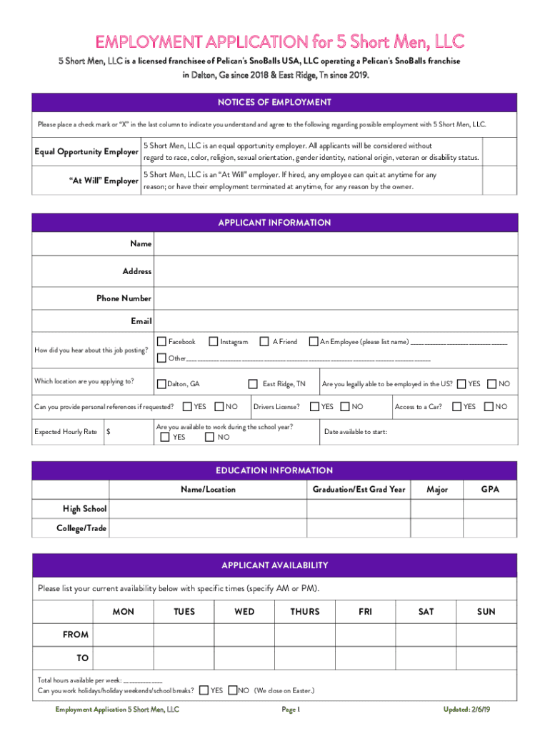 EMPLOYMENT APPLICATION for 5 Short Men, LLC5 Short Men, LLC is a licensed franchisee of Pelican\'s Snowballs USA, LLC operating a Pelican\'s Snowballs franchise in Dalton, Ga since 2018 & East Ridge,