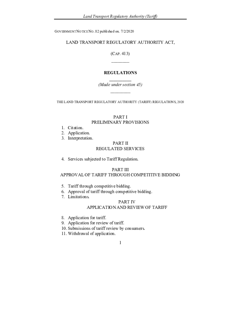 Land Transport Regulatory Authority (Tariff) GN. NO. 82 (Contd.) GOVERNMENT NOTICE NO. 82 published on. 7/2/2020LAND TRANSPORT REGULATORY AUTHORITY ACT, (CAP. 413) ___ REGULATIONS ___ (Made under