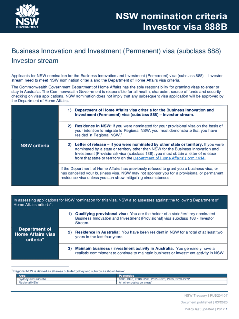 NSW nomination criteria Investor visa 888B Business Innovation and Investment (Permanent) visa (subclass 888) Investor stream Applicants for NSW nomination for the Business Innovation and Investment