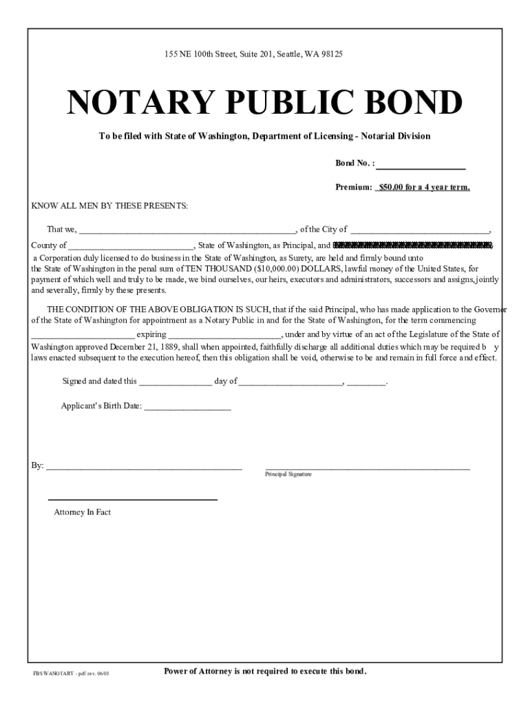 155 NE 100th Street, Suite 201, Seattle, WA 98125NOTARY PUBLIC BOND To be filed with State of Washington, Department of Licensing Notarial Division Bond No. Premium: $50.00 for a 4-year term. KNOW