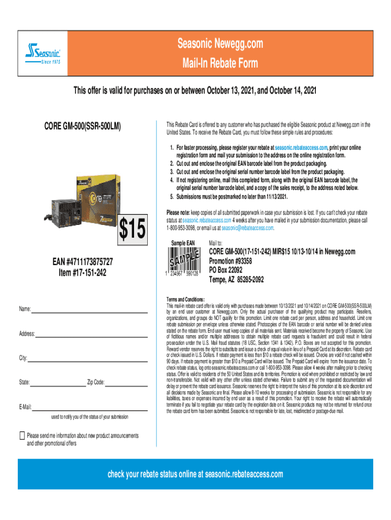 Sea sonic Newegg.com Mailing Rebate Form This offer is valid for purchases on or between October 13, 2021, and October 14, 2021CORE GM500(SSR500LM)This Rebate Card is offered to any customer who has